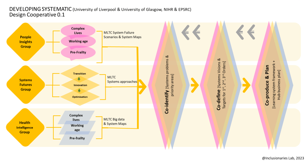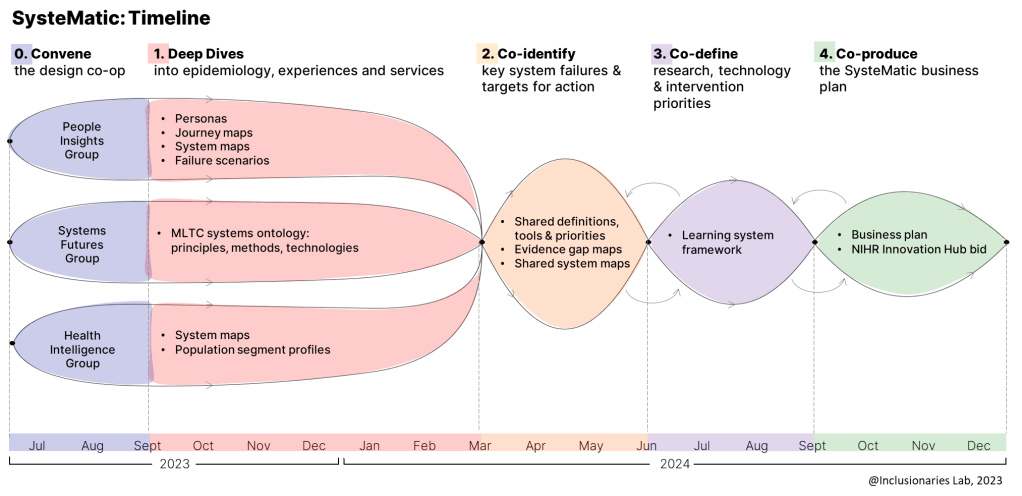 As Systematic’s lead Design knowledge partner, The Inclusionaries Lab led on SysteMatic’s “People Insight” group and partnered in the “Systems Futures” in Stage 1, centring design-led sense-making approaches and embedding advanced combinatory participatory, inclusive, human-centred, speculative and systemic design principles and methodologies in this strategic national health and social care systems innovation initiative.