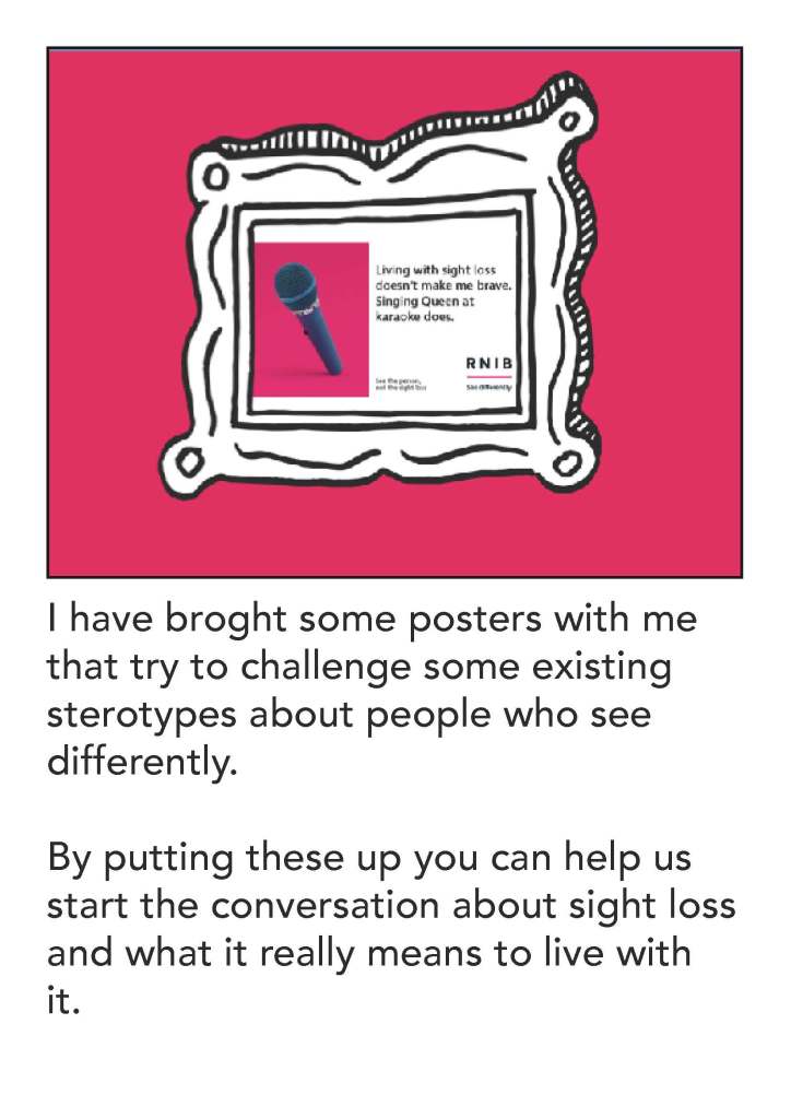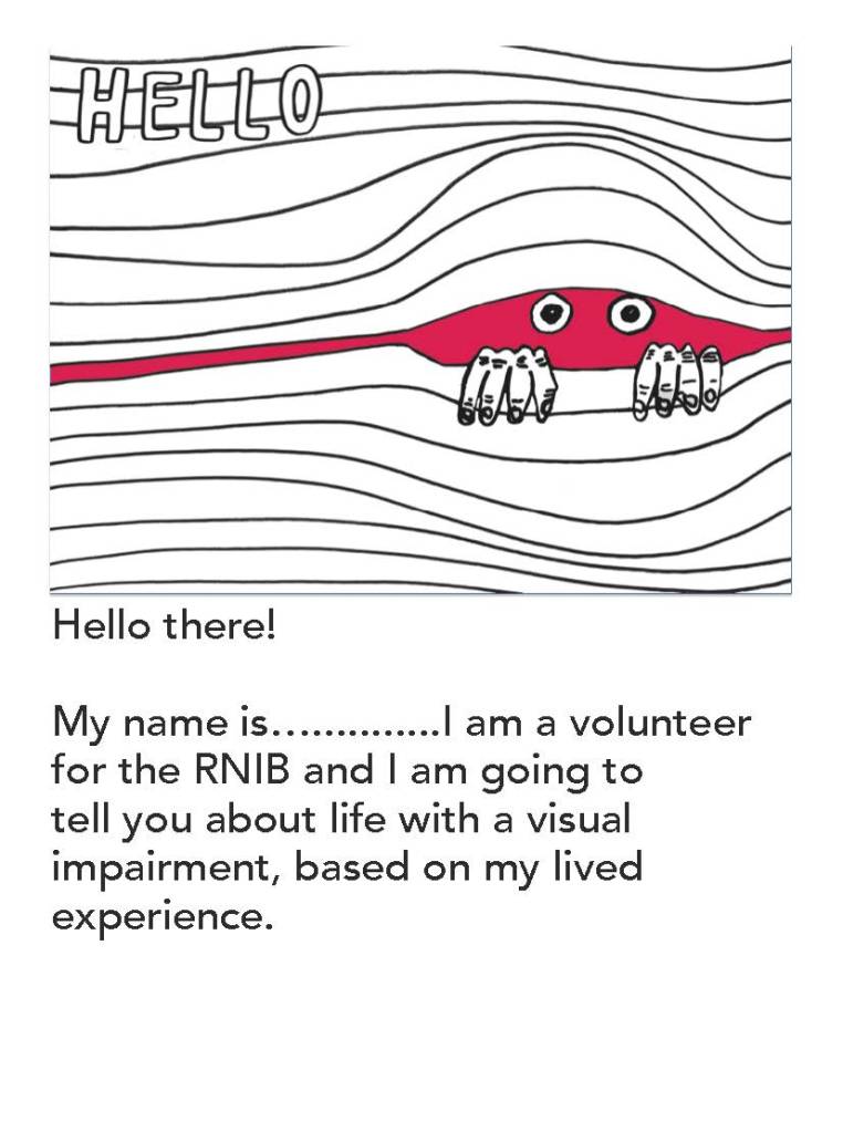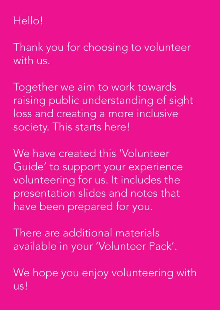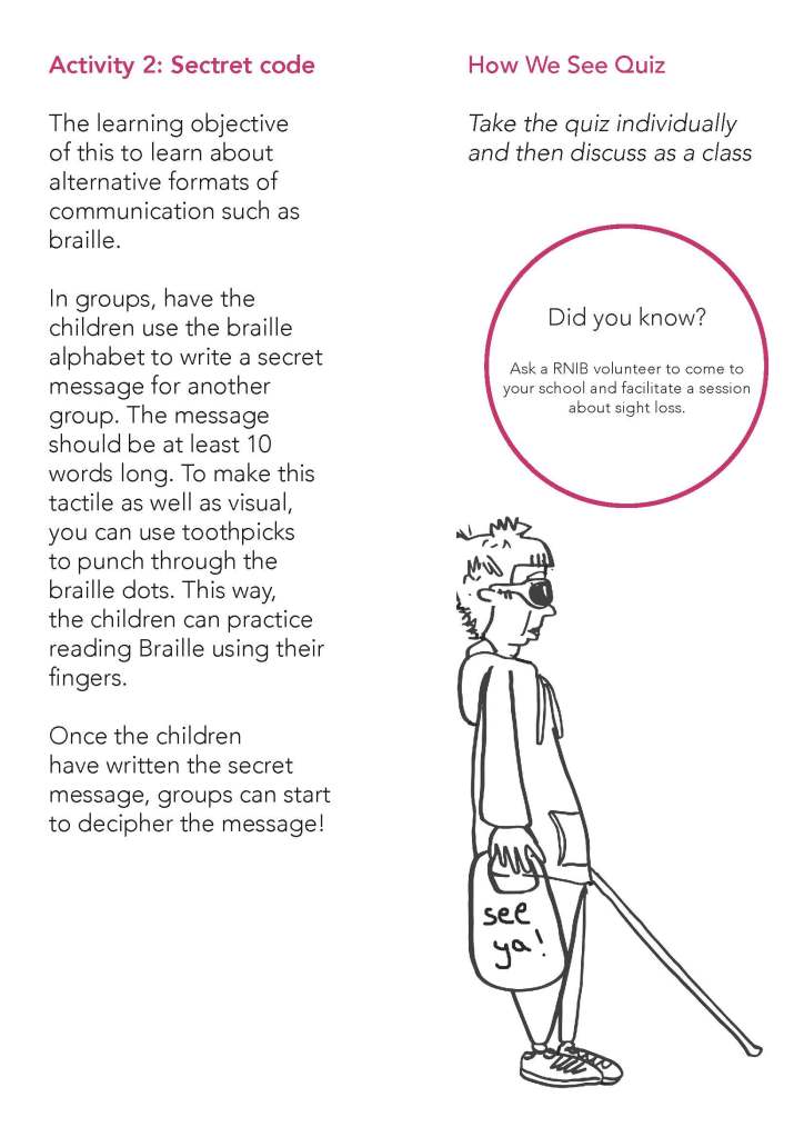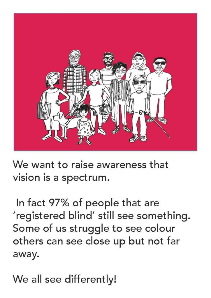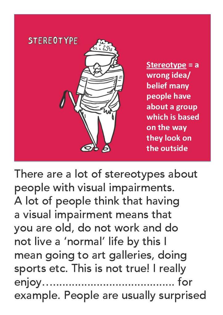 Providing materials for a visually impaired volunteer to visit a school and facilitate a session on sight loss addressing the fact that there are many ‘blind’ people that have remaining sight, confusing language around the topic of sight loss as well as stereotypes and myths around blindness.