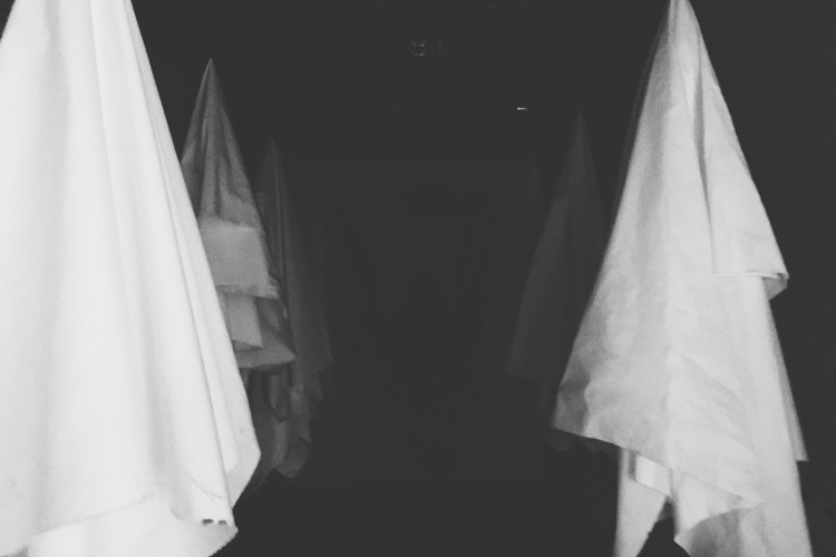 The installation of the conversations took visual inspiration from the symbolic draped urn. Small individual speakers were draped with a cloth and hung so they appeared to float. A light was integrated with the speaker so when the person spoke a light would shine in response. It was installed in a dimly lit basement corridor within Summerhall, Edinburgh. When someone visited the installation from the end of the corridor all the voices seemed to be merged together until they got close enough to focus on one conversation.