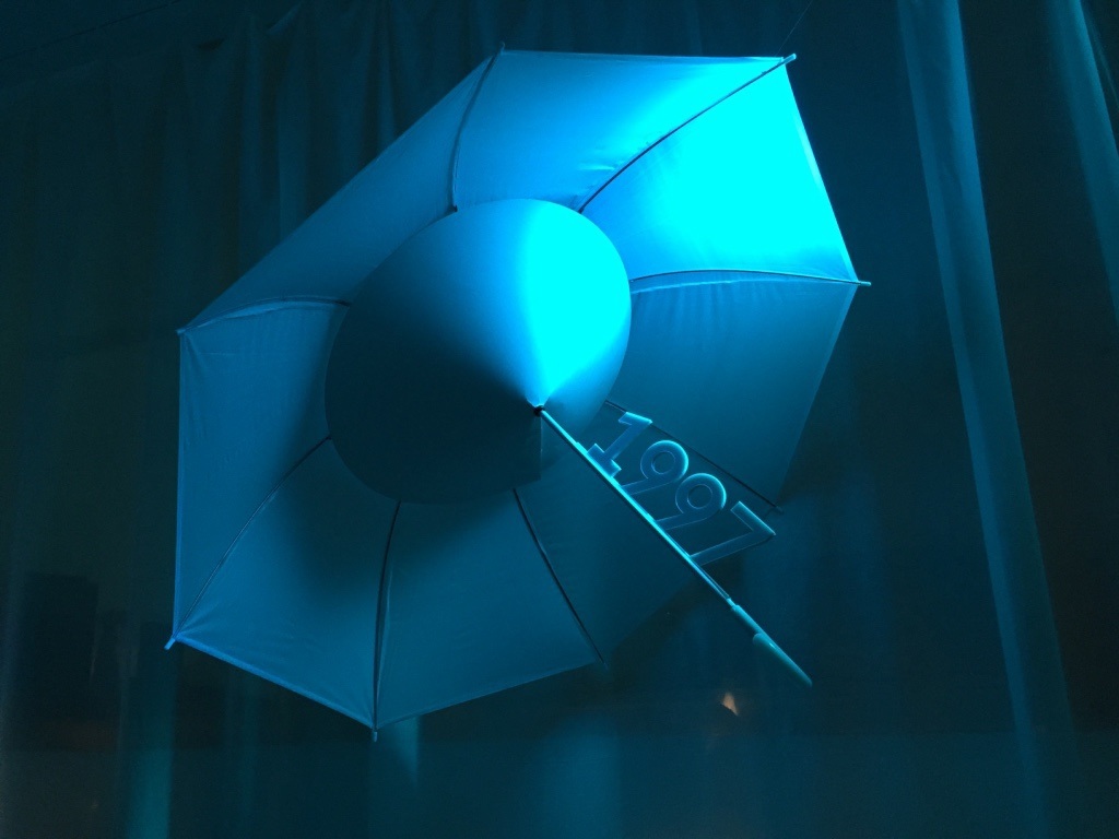 Ten umbrellas are hanging from the ceiling, placed as if they are each a frame of one scene in which an umbrella is tumbling through the wind. Walking through the installation, the visitor “travels through time” through the sounds of mechanical and technological objects that have shaped their own time and changed the future ahead of them. There are five sound compositions in the installation, each played by speakers placed inside the umbrellas. The visitor starts at the 1862 umbrella that has the sound of the beginning of the industrial revolution (semi-automatic looms, cotton mills etc.) and eventually arrives at 2015 where hard mechanical pulsation has been replaced by compressed, seemingly random notification sounds coming from mobile devices.