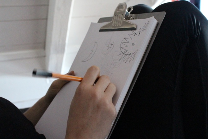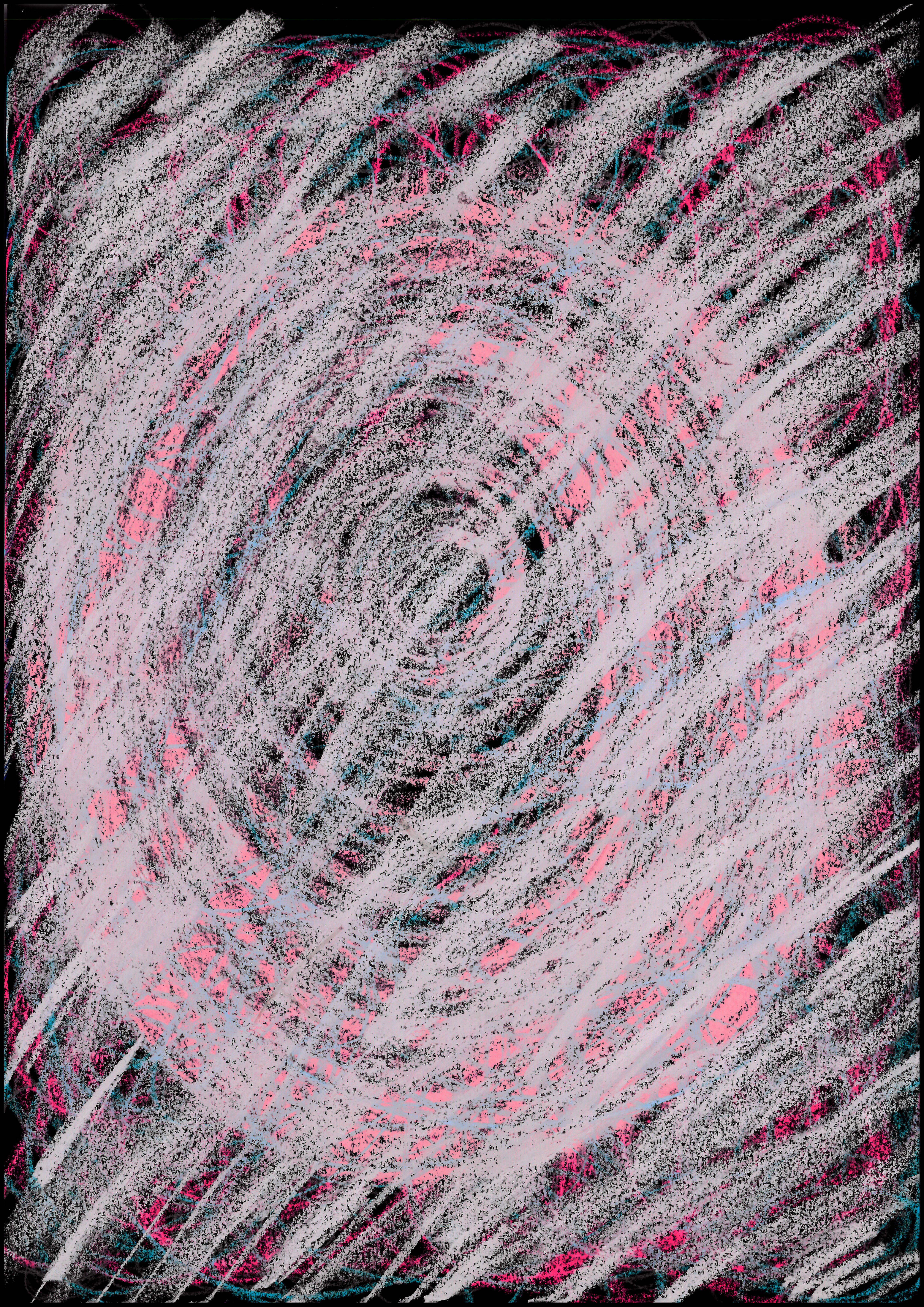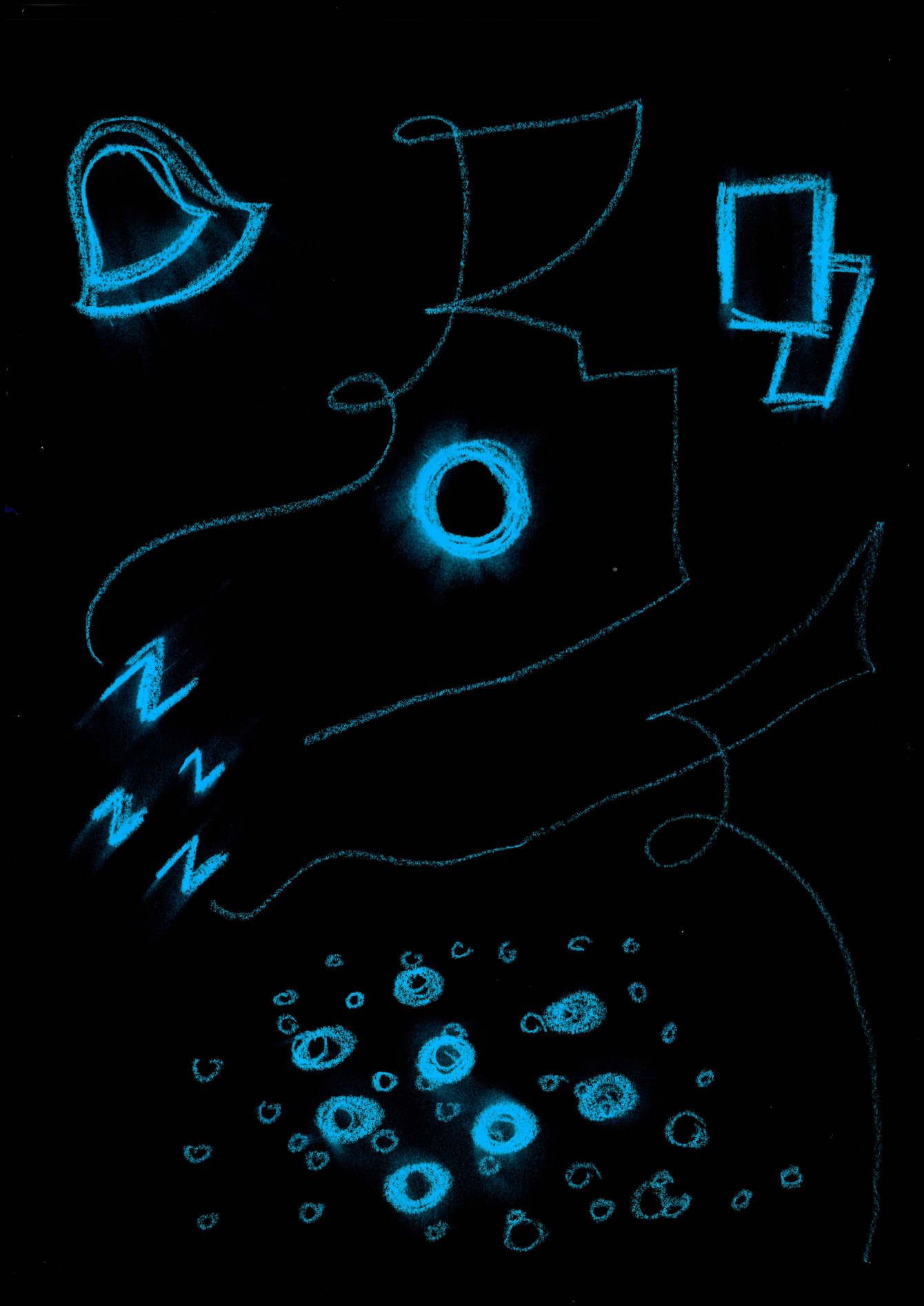 The content of the audio documentary records many mundane observations throughout the journey of sensory deprivation. For example, the artist explains how sitting in a room, she starts to observe whats going on around her. As illustrated in the ‘blind sketches’ the artist describes how she perceives a heightened awareness of sounds in her surrounding. No longer limited, visually, by the segmentation of walls, she can hear not only whats happening in her room, but also in the various floors of the house and outside. “It opens up your perception to your environment”, which in the various ‘blind sketches’ is represented by layering different textures to represent the spectrum of sound (coming from air escaping from a sparking water bottle, rustling papers being organised read by another person at another end of the room, a snoozing sound of a family member napping on the couch in the next room, a dog staring to bark on the floor below as a cat wonders past the window, occasionally passing cars, the chime of a church bell ringing to announce the time and the sound of raindrops growing more and more in frequency and volume).